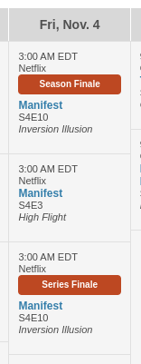my tracker for November 4 shows two Manifest S4 E10 entries, one for Series Finale and one for Season finale. Can this be fixed?