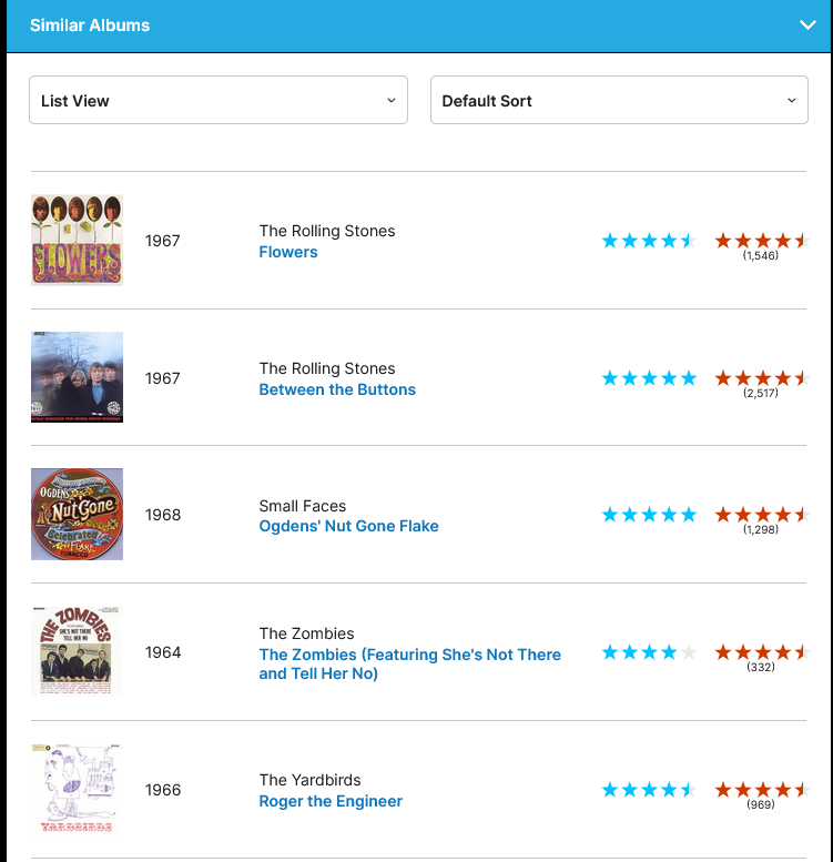 Your new interface no longer shows ratings when clicking on "Similar Albums." I would appreciate if ratings were put back on. Thank You.