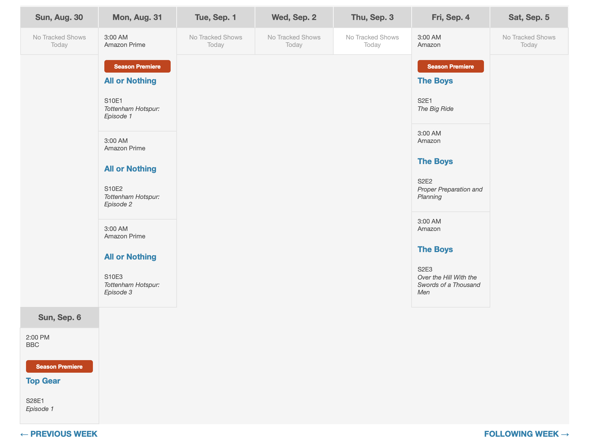On the calendar it shows that Top Gear Season 28 is premiering on the 6th of September but it actually premiered on 26 Jan 2020 and all 6 episodes was released. When I went to the page of the show on SideReel it shows that the season was released from Jan to March.