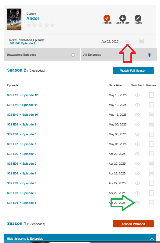 You should also be able to open up the "More Seasons & Episodes" section (by clicking on the blue bar) and mark episodes as watched down there (the green arrow).