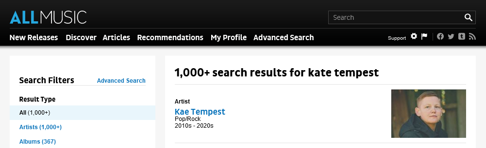 We have added the name Kate Tempest to our search alias database so that the entry for Kae Tempest shows up if you perform that search.